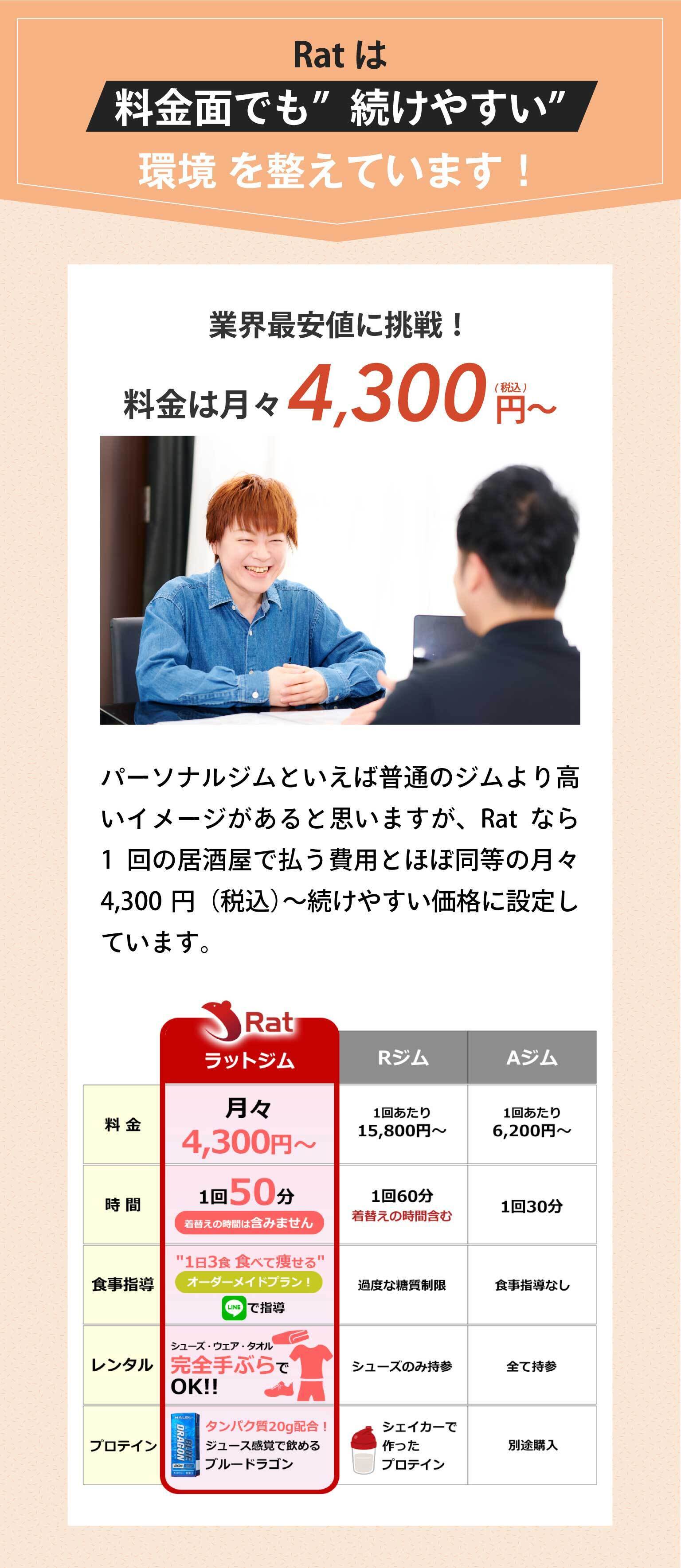 Ratジムではボディづくりとともに痩せ体質にチェンジするためリバウンドしにくくなります。また食事指導も行うので今後の食生活にも役立ち、よりリバウンドしにくくなります。
