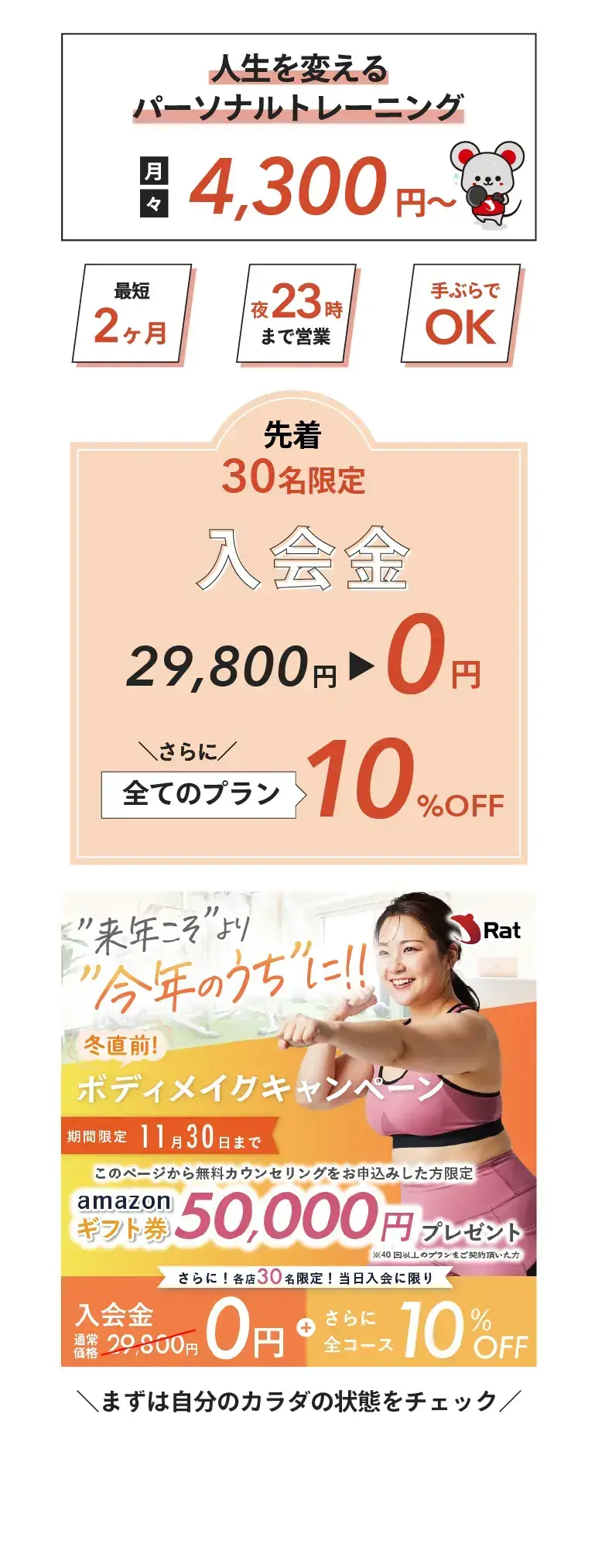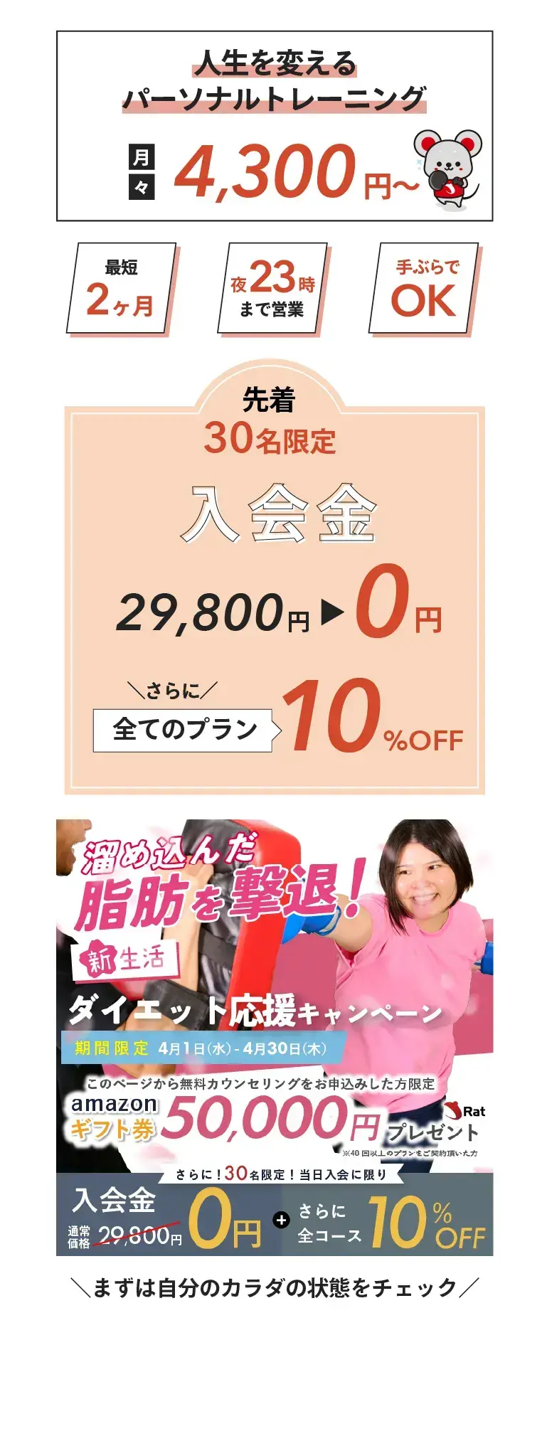 Ratジムでは、そういった場合、プロテインや肉、お魚といったタンパク質を取れる食事メニューを具体的に提案させていただきます。ぜひ無料カウセリングでアドバイスさせて頂きますので、ご相談ください。
