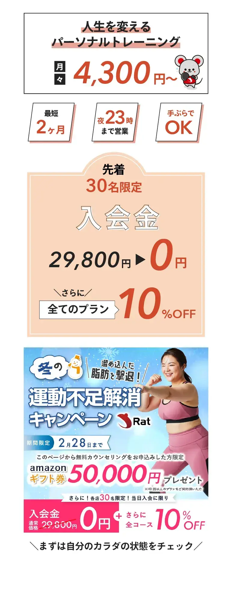 Ratジムでは、そういった場合、プロテインや肉、お魚といったタンパク質を取れる食事メニューを具体的に提案させていただきます。ぜひ無料カウセリングでアドバイスさせて頂きますので、ご相談ください。